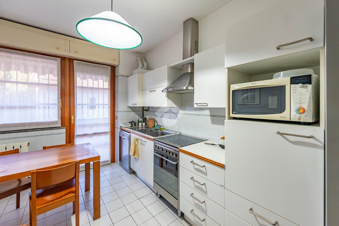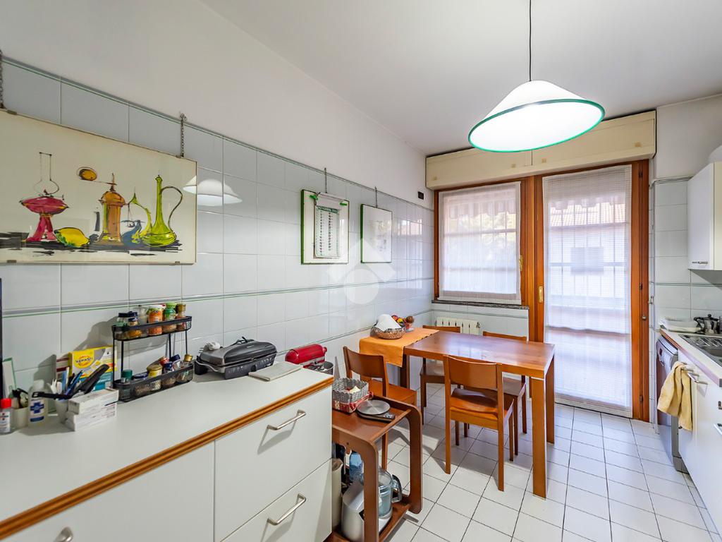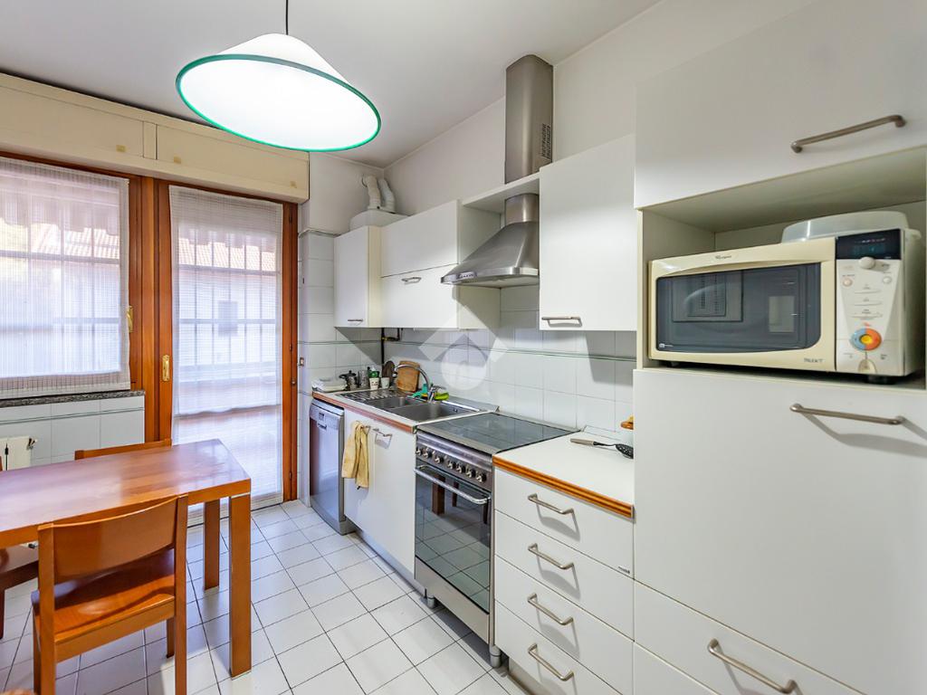 Adiacente alla zona giorno si trova la cucina abitabile, perfetta per colazioni in famiglia o pranzi informali, anch’essa dotata di un balcone con affaccio interno sul cortile.