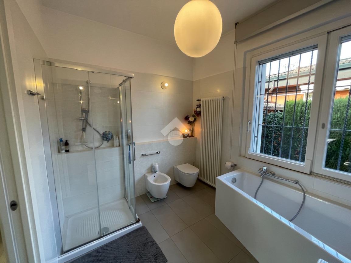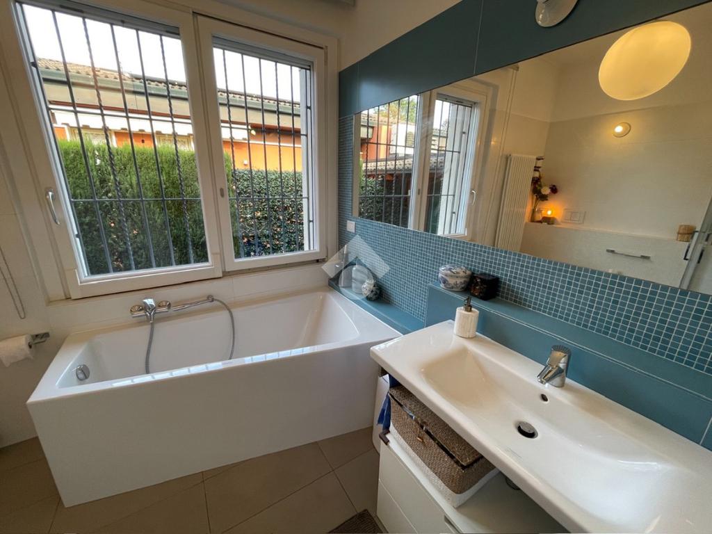 Dal soggiorno è possibile accedere all’ampio bagno padronale dotato di vasca da bagno e doccia.